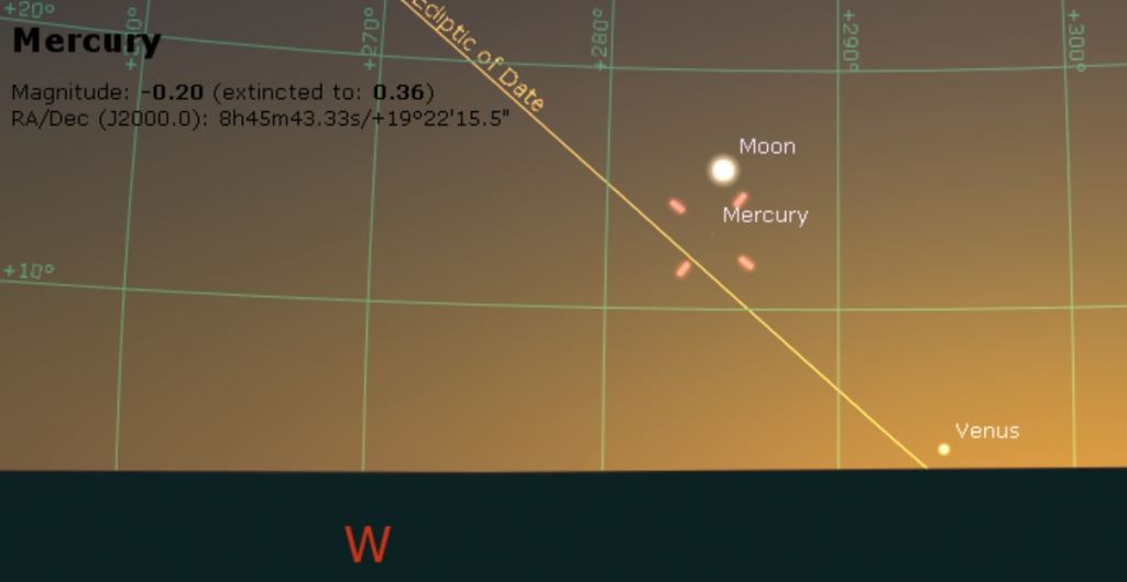 But two challenging planets are now emerging low to the west at dusk: Mercury and Venus. The two interior worlds are now mounting a slow return, as the hunt is now on the recover the two after sunset.