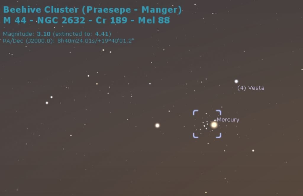 The sky scene becomes ever more dynamic as the month continues. On July 6th, Mercury actually transits (passes in from of) the Beehive Cluster (Messier 44). Use binoculars to catch +4thmagnitude dwarf planet 4 Vesta nearby. Venus also meets Messier 44 on July 18th, though the event is much lower to the horizon.