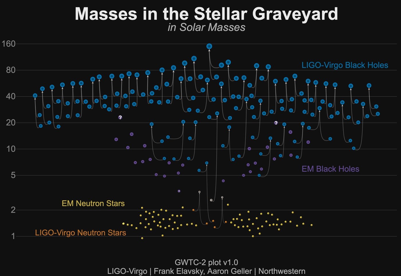 It took about one hundred years, but scientists finally observed these mergers and their gravitational waves in 2015. Since then, the LIGO/Virgo collaboration has detected many of them. The collaboration has released a new catalogue of discoveries, along with a new infographic. The new infographic displays the black holes, neutron stars, mergers, and the other uncertain compact objects behind some of them.