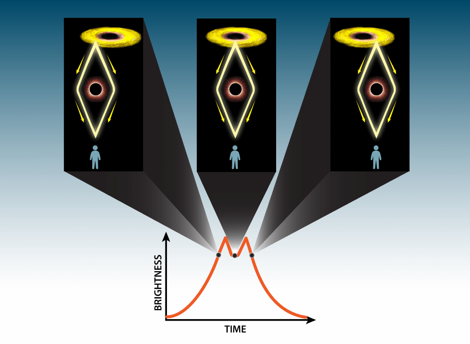 To learn more about the flare, Haiman enlisted the help of his postdoc (Davelaar) to construct a model for this flaring effect. While the model confirmed the spikes, it also revealed a periodic dip in brightness that they could not explain. After eliminating the possibility that this resulted from errors in the model, they determined that the signal was real and began looking for a physical mechanism that could explain it. Eventually, they realized that each dip closely corresponded to the time it took for the BHs to make transits relative to the observer.