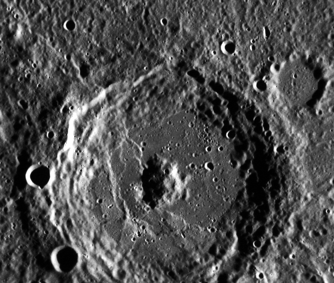 spacecraft. The 53-mile (83-km) -wide crater features a large, rounded central peak and numerous lobate scarps lining its floor.