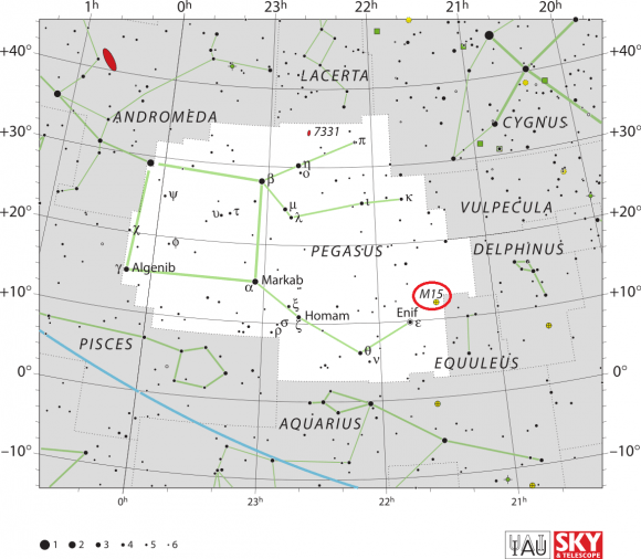 The location of M15, within the Pegasus Constellation. Credit: IAU and Sky & Telescope magazine (Roger Sinnott & Rick Fienberg)