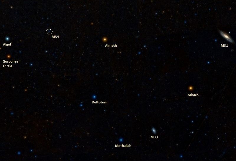 M34 is easily found in binoculars about two fields of view northwest of Algol(Beta Persei). You will know when you have found this distinctive star cluster because "X" marks the spot! In a telescope finderscope, it will appear as a faint, hazy spot and will fully resolve to most average telescopes. Messier 34 makes an excellent target for moonlit nights or light polluted areas and will stand up well to less than perfect sky conditions.