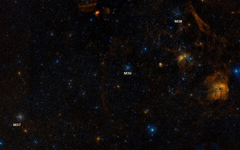 You will note two very conspicuous clusters of stars in this area, and so did Le Gentil in 1749. Binoculars will reveal the pair in the same field, as will telescopes using lowest power. The dimmest of these is the M38, and will appear vaguely cruciform in shape. At roughly 4200 light years away, larger aperture will be needed to resolve the 100 or so fainter members. About 2 1/2 degrees to the southeast (about a finger width) you will see the much brighter M36.