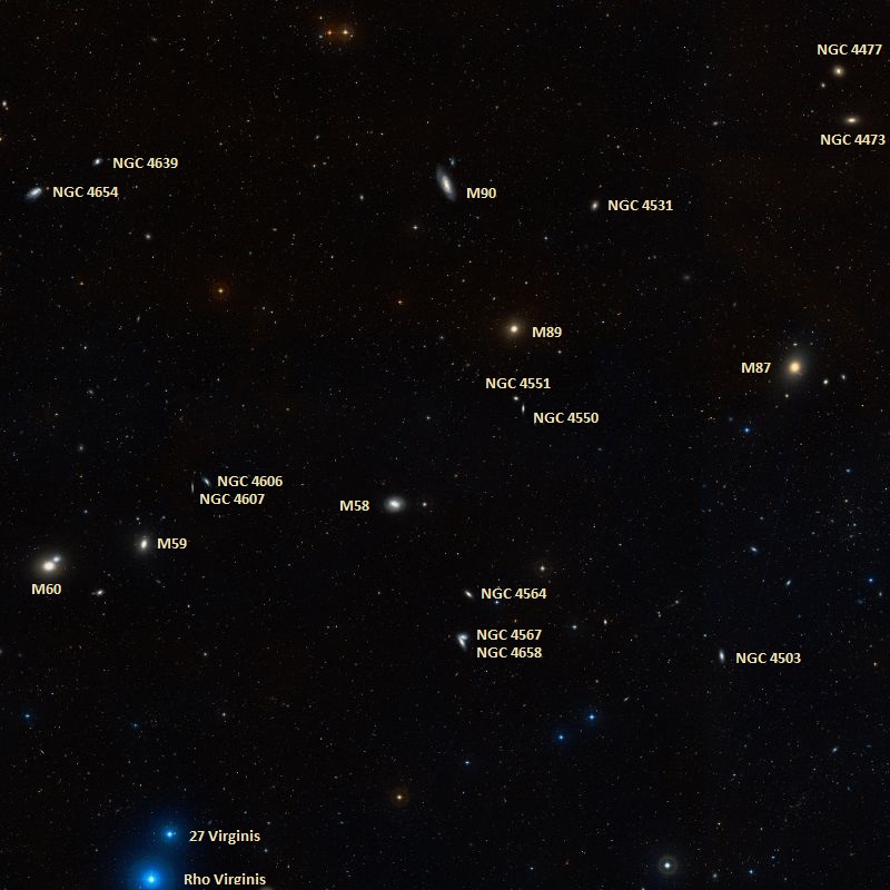 At a little brighter than magnitude 9, this galaxy could be spotted with binoculars, but stick with your telescope. In the same low power field (depending on aperture size) you may also note faint NGC 4647 which only appears to be interacting with M60. Also in the field to the west (the direction of drift) is our next Messier, bright cored elliptical M59. Now we will need to continue about an average eyepiece field of view, or a degree further west of this group to bring you to our "galactic twin", fainter M58.