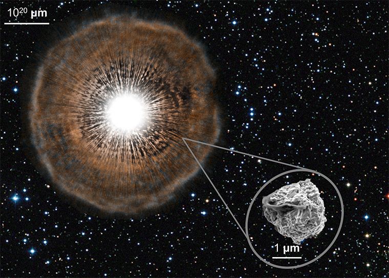 Graphic showing the presolar material forming out of a star explosion or a carbon star.