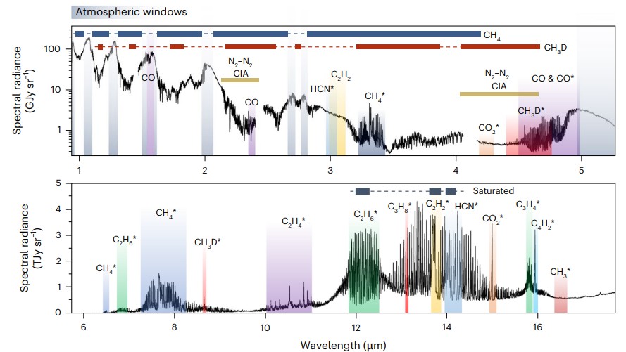 This figure from the research shows the JWST's spectroscopy results from NIRSpec (top) and MIRI (bottom). Grey bands in the top image show Titan's atmospheric windows. Note the detection of CH~3~in the MIRI data, the first definitive detection of the methane radical in the moon's atmosphere. Image Credit: Nixon et al. 2025, Nature Astronomy.