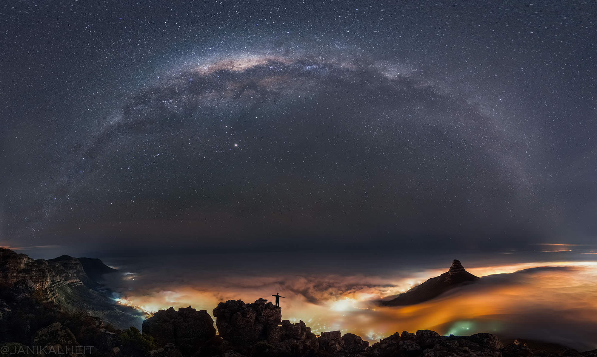 I set my tripod on top of a large rock that gave me a bit of extra height so that I could get as much of the city lights in the shot as possible. The idea I had in my mind was to shoot a panorama from the center of the city to the Twelve Apostles Mountains in the southwest. This was a pretty large area to cover, plus the Milky Way was pretty much straight above us which meant I had to shoot a massive field of view in order to get both the city and the Milky Way.