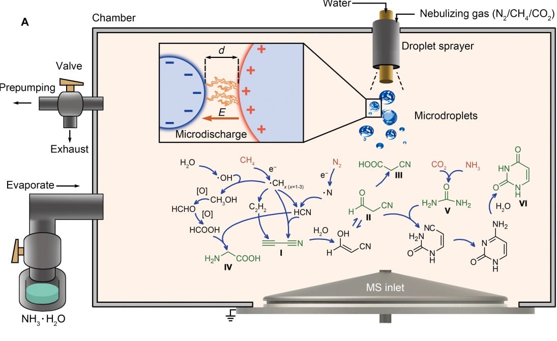 This schematic shows how the prebiotic synthesis experiment worked. Gases (N2, CH4, CO2, and NH3) in orange surround a spray containing larger positively and smaller negatively charged water microdroplets, which, when they come into proximity, cause a microlightning, forming the products in green: (I) cyanoacetylene, (II) cyanoacetaldehyde, (III) cyanoacetic acid, (IV) glycine, (V) urea, and (VI) uracil. Image Credit: Meng et al. 2025.