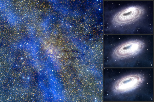 [/caption] Two different telescopes simultaneously observed violent flares from the supermassive black hole in the center of the Milky Way. The outbursts from this region, known as Sagittarius A*, reveal material being stretched like bread dough out as it orbits in the intense gravity close to the central black hole. Using ESO's Very Large Telescope (VLT) and the Atacama Pathfinder Experiment (APEX) telescope, both in Chile, to study light from Sagittarius A* at near-infrared wavelengths and the longer submillimeter wavelengths, astronomers have for the first time concurrently caught a flare with these telescopes. "Observations like this, over a range of wavelengths, are really the only way to understand what's going on close to the black hole," says Andreas Eckart of the University of Cologne, who led the team.