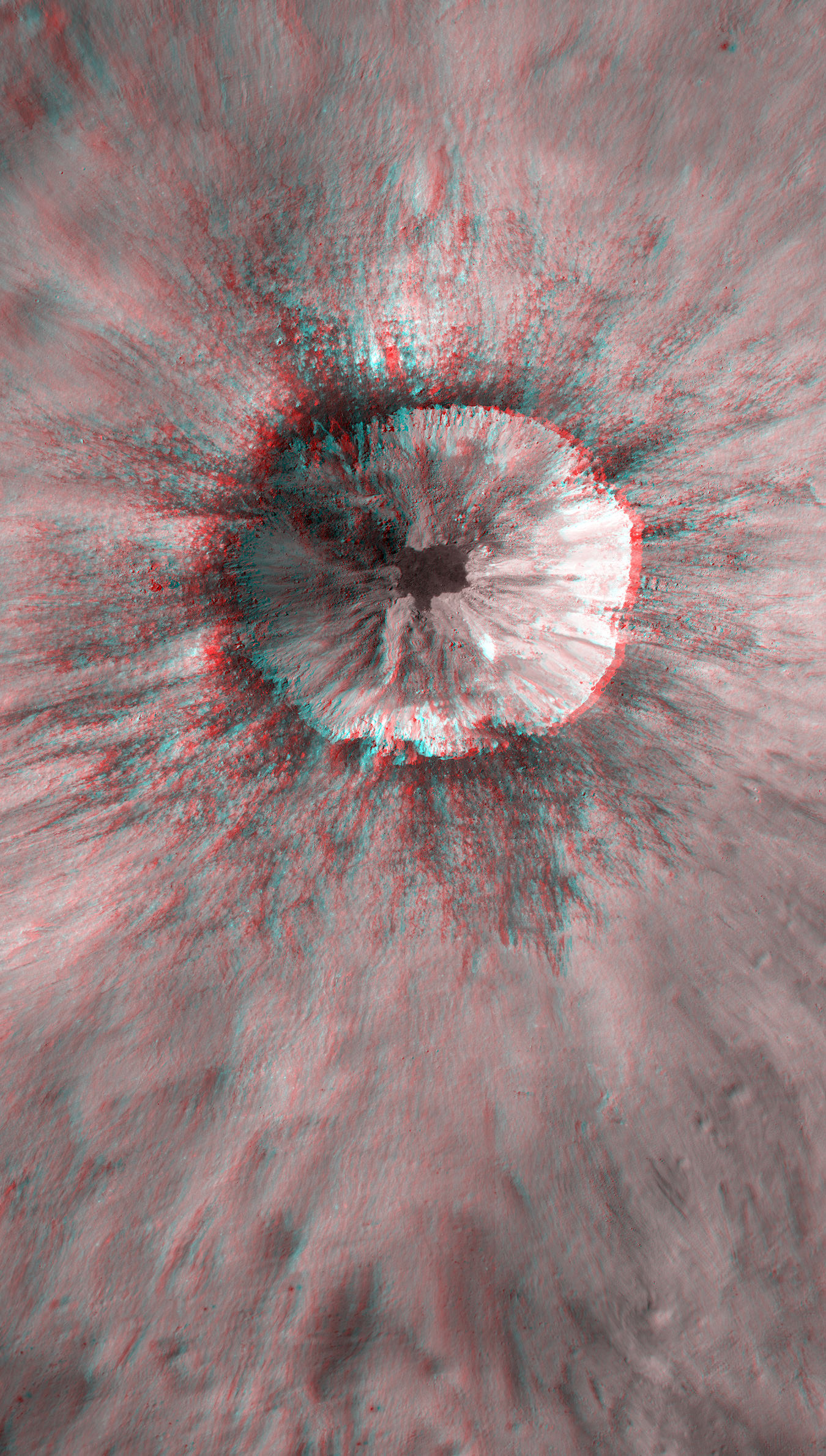 of the Moon this weekend, here's some great 3-D closeups courtesy of the Lunar Reconnaissance Orbiter and imaging wizard Nathanial Burton Bradford. This great 3-D view (Red/Cyan glasses needed) shows quite an interesting young impact crater on the Moon, (17.682°S, 144.408°E) west of Isaev crater. Click on the image for a larger view, and in 3-D you can dive right in and see all the nooks and crannies – what scientists call complex crater morphology.