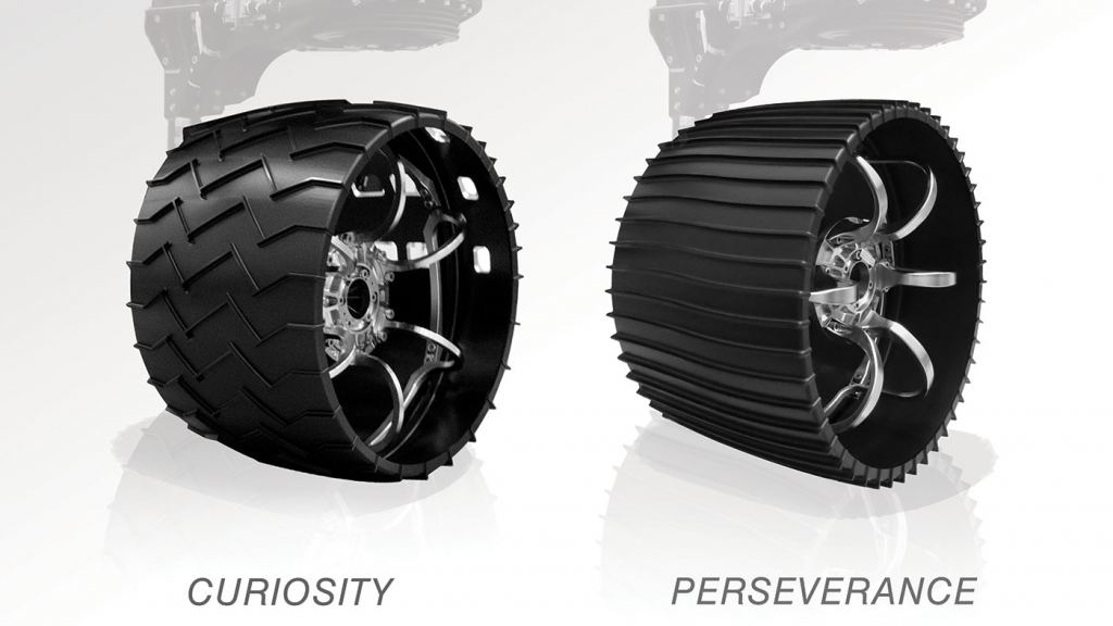 Vandi Verma, Senior engineer and rover driver at NASA JPL, notes Percy's wheels are quite loud given they are metal rather than rubber. The rover's wheel design has also been upgraded from the previous rover, Curiosity. Both rovers feature wheels of flight-grade aluminum with titanium spokes. As Mars rocks experience little weathering, they feature sharp edges and have inflicted damage to Curiosity's wheels over course of its mission. As a result, rover operators changed how/where they are navigating. Perseverance's wheel design features a thicker aluminum than Curiosity (1mm vs 0.75mm) and a new tread design. In testing, the new tread was shown to be more resilient to sharp rocks and increased Perseverance's traction over that of Curiosity's.
