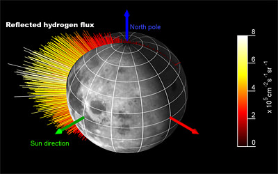 The hydrogen shoots off with speeds of around 200 km/s and escapes without being deflected by the Moon's weak gravity. Hydrogen is also electrically neutral, and is not diverted by the magnetic fields in space. So the atoms fly in straight lines, just like photons of light. In principle, each atom can be traced back to its origin and an image of the surface can be made. The areas that emit most hydrogen will show up the brightest.
