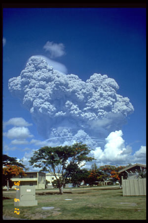 On June 12, 1991, millions of cubic meters of magma reached the surface, beginning several days of eruptions. Even more magma reached the surface on June 15th, ejecting more than 5 cubic kilometers of material. An ash cloud rose 35 kilometers into the air, covering the surrounding region in meters of ash. Dangerous pyroclastic flows of hot ash, rock and water surged down the sides of the volcano, destroying everything in their path. The huge eruption gouged out a caldera 2.5 km across.