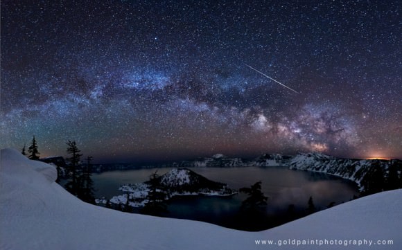Caption: Milky Way and Lyrid Meteor over Crater Lake. Credit: Brad Goldpaint.