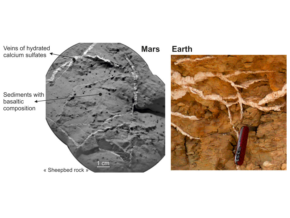 The set of images below shows the similarity of sulfate-rich veins seen on Curiosity rover to sulfate-rich veins seen on Earth. The view on the left is a mosaic of two shots from the remote micro-imager on Curiosity's Chemistry and Camera (ChemCam) instrument on Dec. 14, 2012, or the 126th sol, or Martian day, of operations. They show a view of "Sheepbed" rock in the "Yellowknife Bay" area of Mars. The sulfate-rich veins are the light-colored veins about 1 to 5 millimeters (0.04 to 0.2 inches) wide.