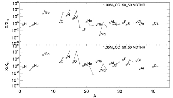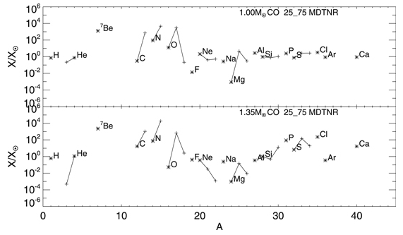 The team modelled WDs of different masses, and they changed the ratio of WD material to stellar companion material. And this is where the Li and Beryllium (Be) comes in.