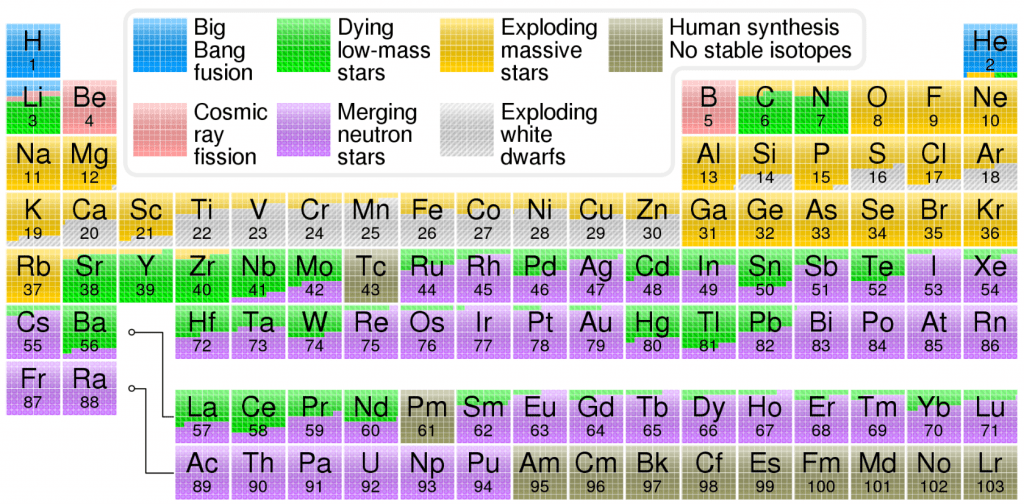 In a periodic table that shows the sources of the elements in the Universe, lithium stands out as the only element that is created through three different processes: Big Bang nucleosynthesis, cosmic ray fission, and low-mass stars like our Sun, when they reach the end of their lives.