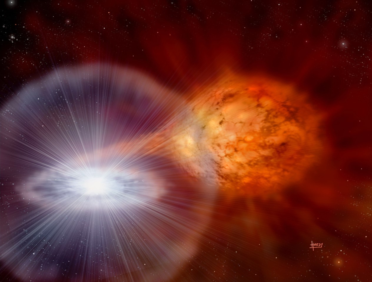 The team of researchers looked at what are known as classical novae (CN). In a CN, a white dwarf is in a binary pair with a larger star. The white dwarf (WD) is a stellar remnant, a star that has ceased fusion, and shines only with the light of stored thermal energy. A WD usually has about the same mass as our Sun, but its volume is similar to Earth's.