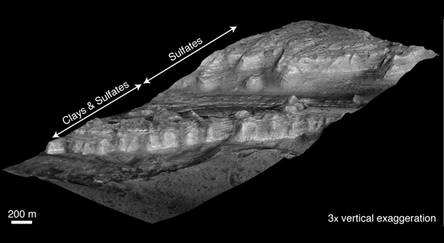 [/caption] Milliken and two co-authors of a paper in Geophysical Research Letters say that clay minerals, which form under very wet conditions, are concentrated in layers near the bottom of the Gale stack. Above that, sulfate minerals are intermixed with the clays. Sulfates form in wet conditions and can be deposited when the water in which they are dissolved evaporates. Higher still are sulfate-containing layers without detectable clays. And at the top is a thick formation of regularly spaced layers bearing no detectable water-related minerals. [caption id="attachment_55547" align="alignnone" width="330" caption="Layers of rock in the upper portion of a tall mound near the center of Gale Crater on Mars exhibit a regular thickness of several meters, unlike the less regular pattern of layers in the lower formation on the same mound. Image credit: NASA/JPL-Caltech/University of Arizona "]