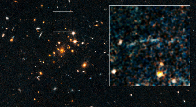 The arc was spotted in optical images of the cluster taken in 2010 by Hubble's Advanced Camera for Surveys. The infrared capabilities of Hubble's Wide Field Camera 3 helped provide a precise distance, confirming it to be one of the farthest clusters yet discovered.