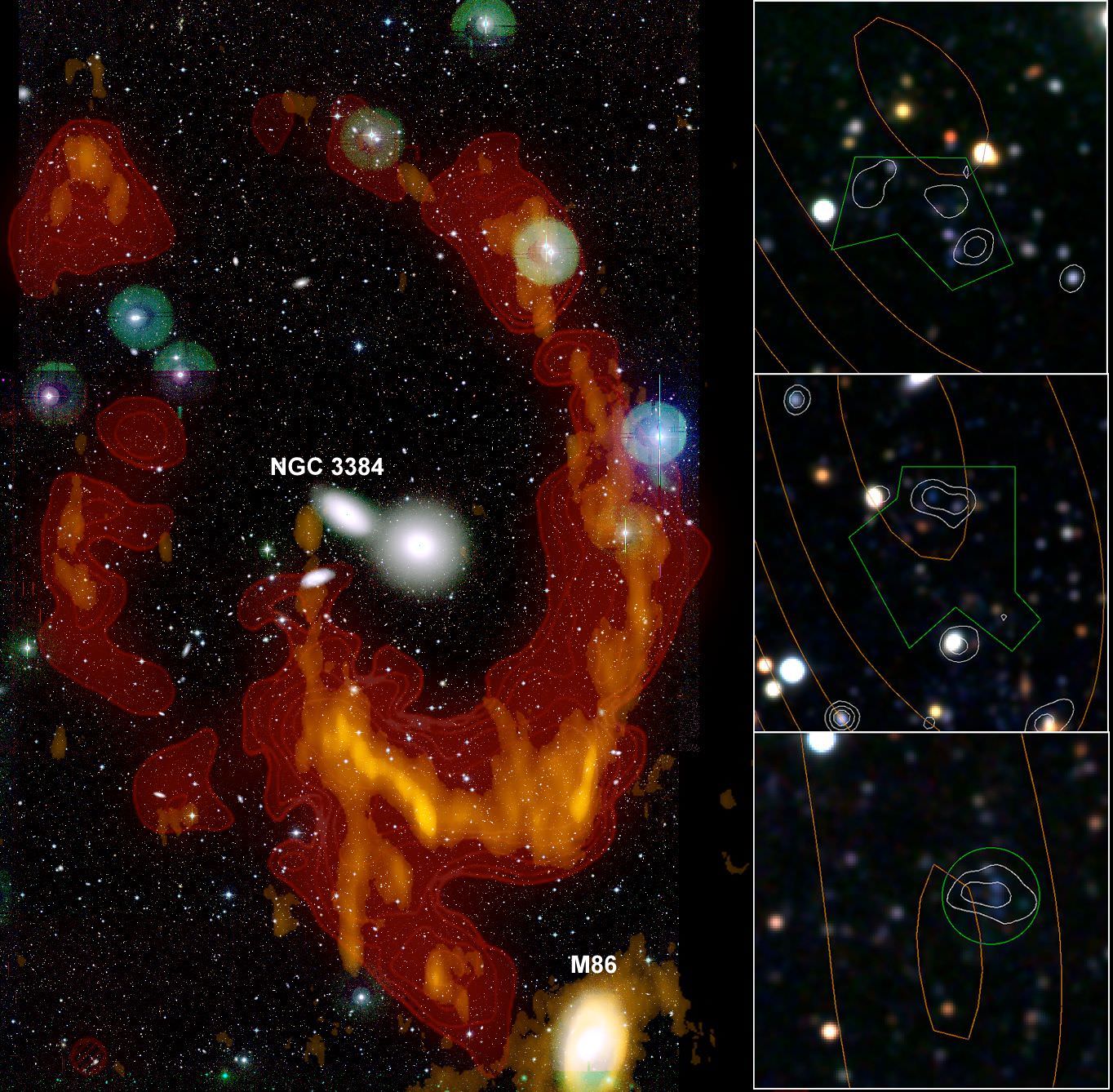 An international team unveiled the origin of the giant gas ring in the Leo group of galaxies. With the Canada-France-Hawaii Telescope, the scientists were able to detect an optical signature of the ring corresponding to star forming regions. This observation rules out the primordial nature of the gas, which is of galactic origin. Thanks to numerical simulations made at CEA, a scenario for the formation of this ring has been proposed: a violent collision between two galaxies, slightly more than one billion years ago. The results will be published in the Astrophysical Journal Letters.