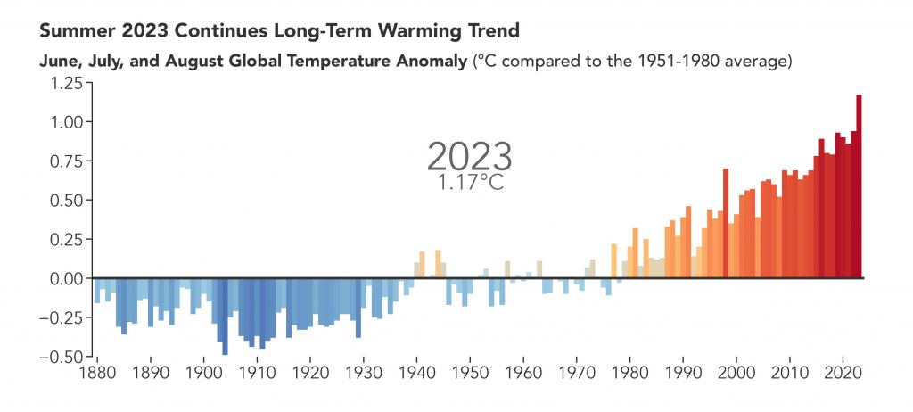 According to GISTEMP, the months of June, July, and August combined were 0.23 °C (0.41 °F) warmer than any other summer on record and 1.2 °C (2.1 °F) warmer than the seasonal average between 1951 and 1980. Said NASA Administrator Bill Nelson in a NASA press release:
