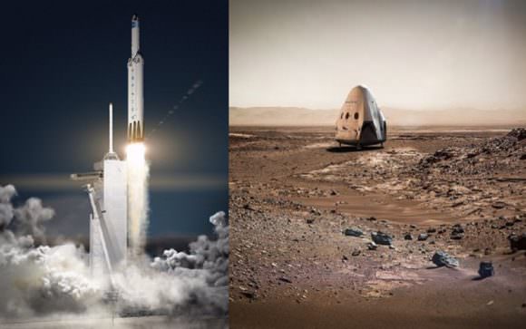 Artistic concepts of the Falcon Heavy rocket (left) and the Dragon capsule deployed on the surface of Mars (right). Credit: SpaceX