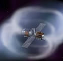 Above: An artist's concept of a space probe inside a magnetic bubble (or "plasma sail"). Charged particles in the solar wind hit the bubble, apply pressure, and propel the spacecraft. [more]