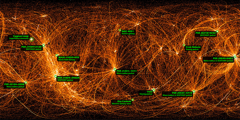 It was this data, gathered during the "night moves" of the NICER instrument, that went into the creation of the image. Each arc traces the movements of particularly bright X-ray sources - which consists of pulsars, black holes, and distant galaxies (labeled in the image above) - relative to the ISS as it orbits the Earth.