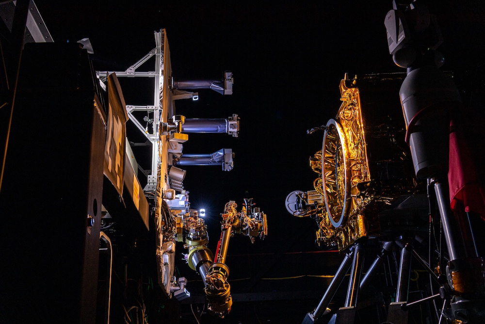 The On-orbit Servicing, Assembly, and Manufacturing 1 (OSAM-1) test bed testing a robotic arm.