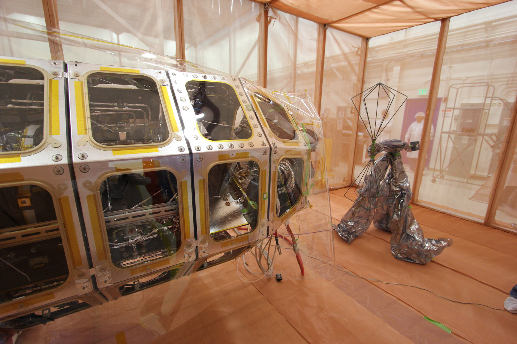 NASA's Lunar Atmosphere and Dust Environment Explorer (LADEE) Observatory sits beside a radio frequency antenna inside an enclosure that blocks external static to detect electromagnetic emissions. Image credit: NASA Ames