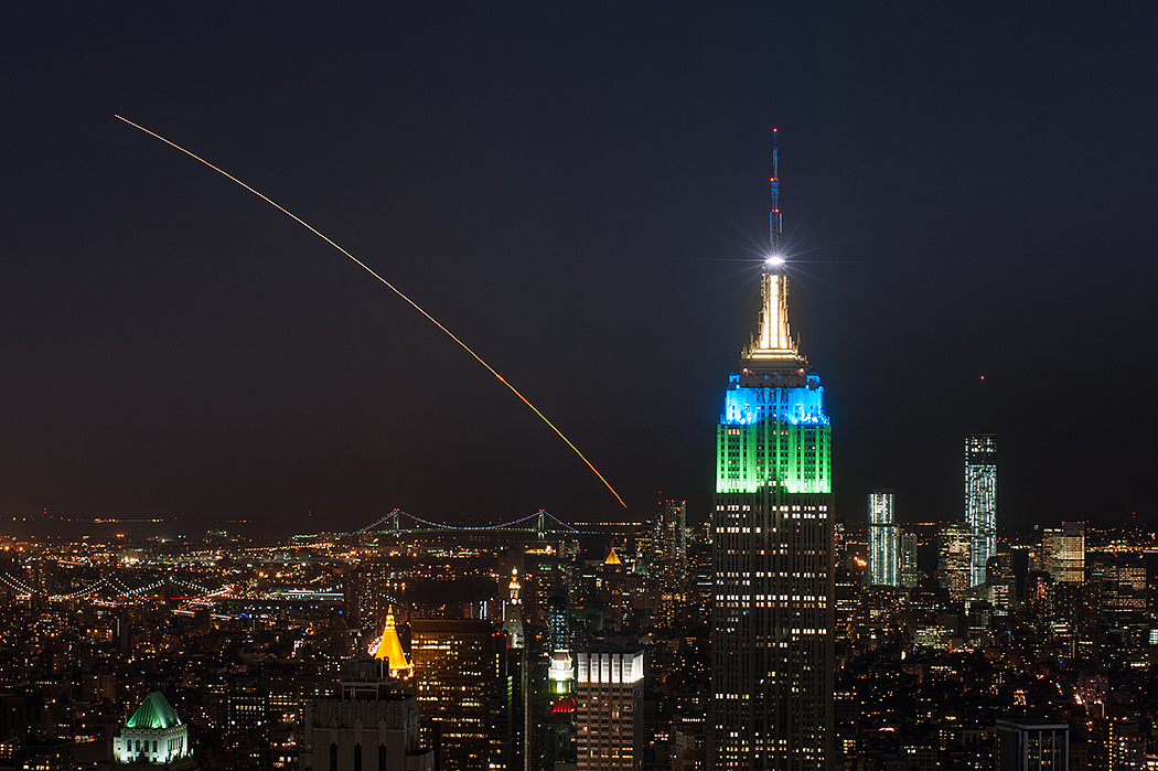 This magnificent view of NASA's LADEE lunar orbiter launched on Friday night Sept 6, on the maiden flight of the Minotaur V rocket from Virginia was captured by space photographer Ben Cooper perched atop Rockefeller Center in New York City. Credit: Ben Cooper/Launchphotography.com