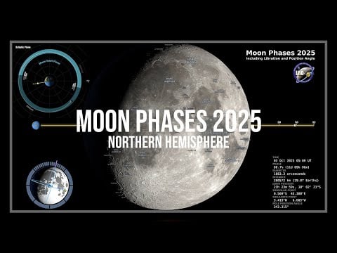 The animation shows the phases, and libration at hourly intervals until the end of 2025. One month is compressed down into about 24 seconds to give a comprehensive view of the year ahead.