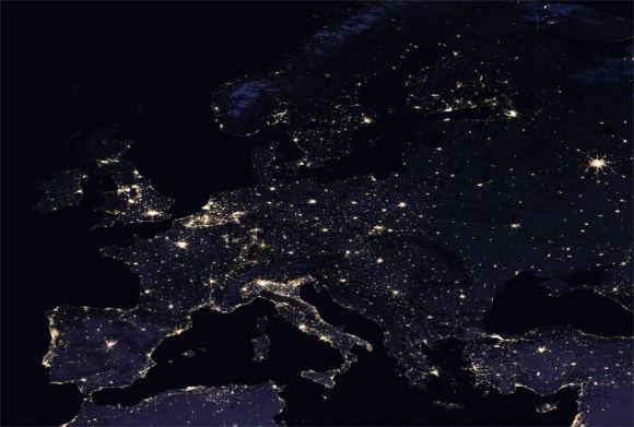 A glittering night-time map of Europe. Looks like there's a Kraftwerk concert happening in Dusseldorf! NASA Earth Observatory images by Joshua Stevens, using Suomi NPP VIIRS data from Miguel Román, NASA's Goddard Space Flight Center[/caption]
