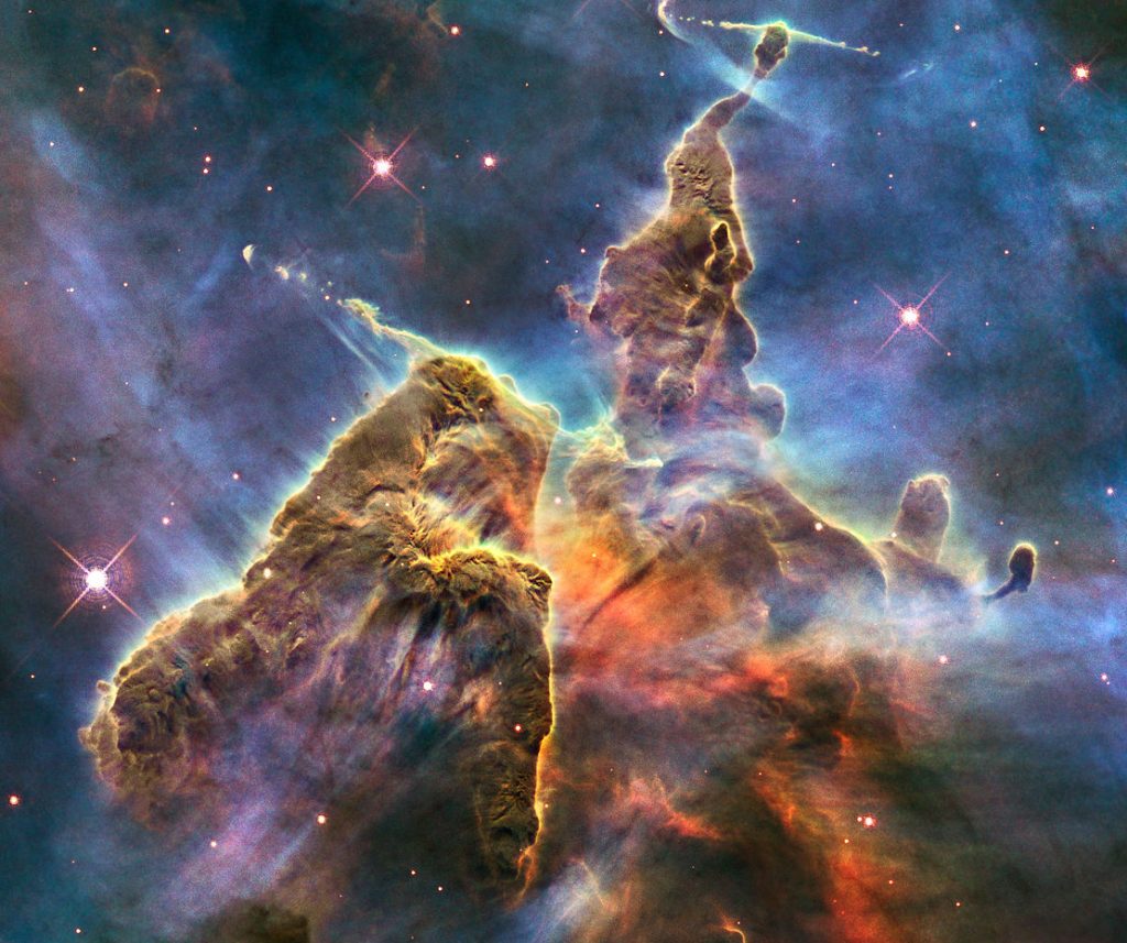 Carina Nebula. The Carina Nebula is one of the largest and brightest nebulae in the sky, located approximately 7,600 light-years away in the southern constellation Carina. Nebulae are stellar nurseries where stars form. The Carina Nebula is home to many massive stars, several times larger than the Sun. For reference (and comparison next week) here's an image of the Carina Nebula from the Hubble Space Telescope: