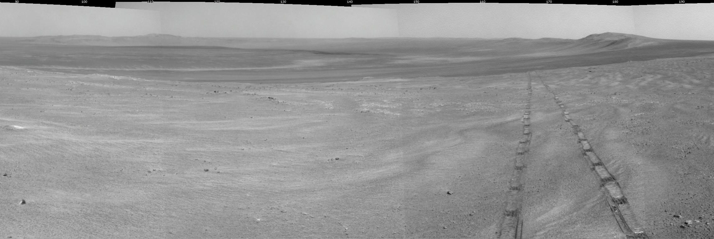 [caption id="attachment_90664" align="aligncenter" width="580" caption="Opportunity - Wide panoramic view inside vast Endeavour Crater snapped ascending Cape York crater ridge on Sol 2754, October 23, 2011. Opportunity wheel tracks at center. Cape Tribulation and distant, far side Endeavour crater rim in background. Opportunity is now driving to the northern tip of Cape York in search of a winter haven to survive upcoming brutal Martian Antarctic winter temperatures. Credit: NASA/JPL/Cornell"]
