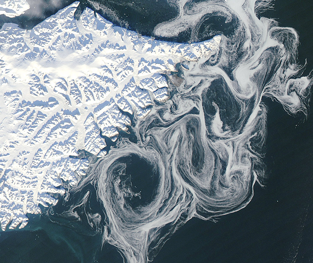 Spooky spectral swirls of last season's sea ice drift in currents off the coast of eastern Greenland in this image from NASA's