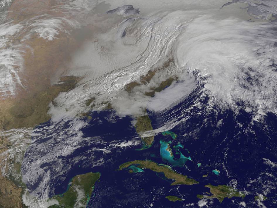 Acquired at 9:01 a.m. EST, the GOES image shows clouds associated with the western frontal system stretching from Canada through the Ohio and Tennessee valleys and down into the Gulf of Mexico. The comma-shaped low pressure system located over the Atlantic, east of Virginia, is forecast to merge with the front and create a powerful nor'easter, which