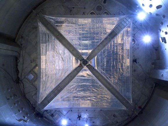 [caption id="attachment_89875" align="aligncenter" width="580" caption="A solar sail system, measuring 66 feet on each side was tested in 2005 in the world's largest vacuum chamber. Image Credit: NASA"]