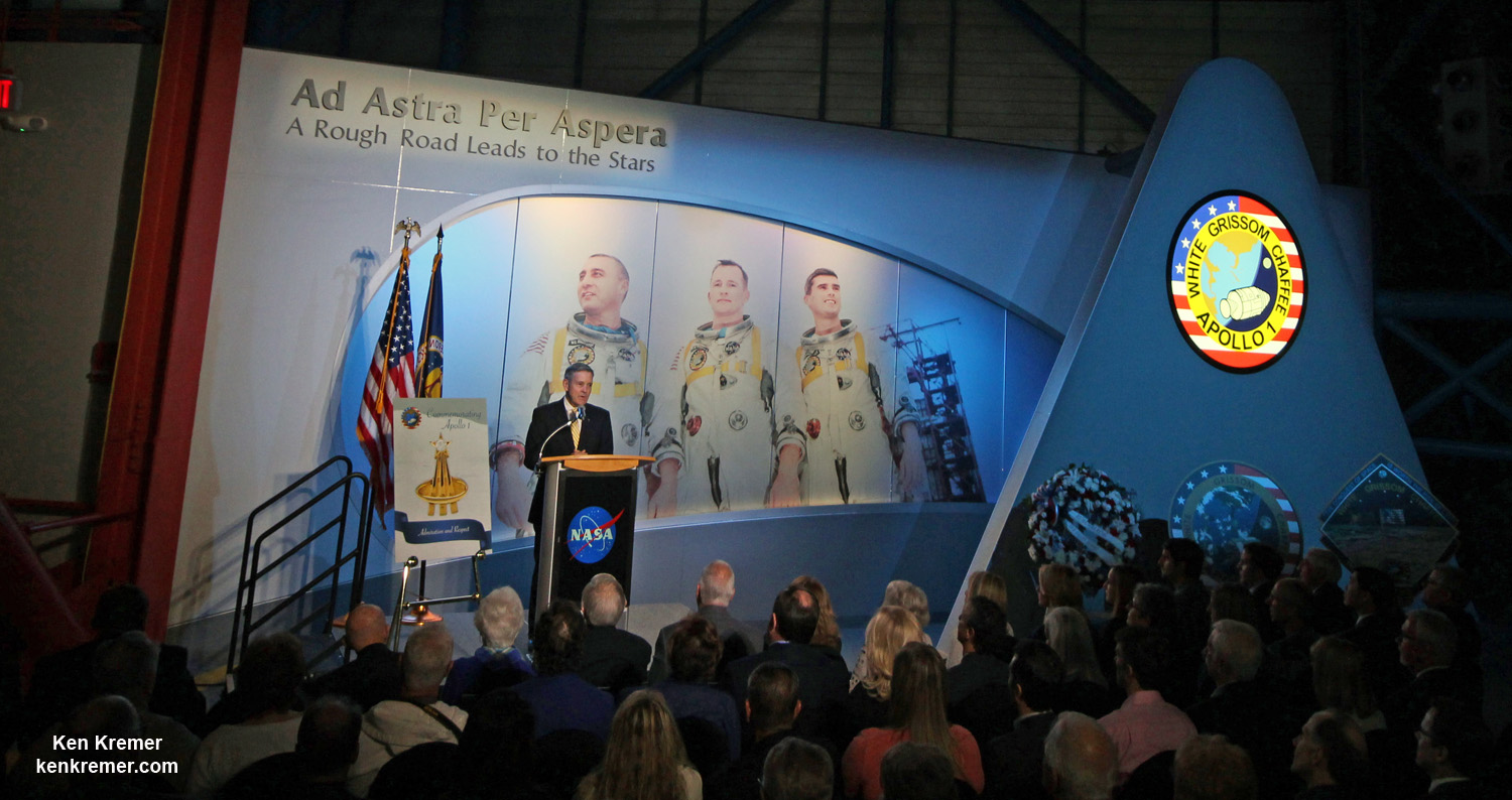 KENNEDY SPACE CENTER VISITOR COMPLEX, FL - NASA unveiled a new tribute exhibit honoring three fallen astronaut heroes 50 years to the day of the Apollo 1 tragedy on January 27, 1967 when the three man crew perished in a flash fire on the launch pad during a capsule test that was not considered to be dangerous.