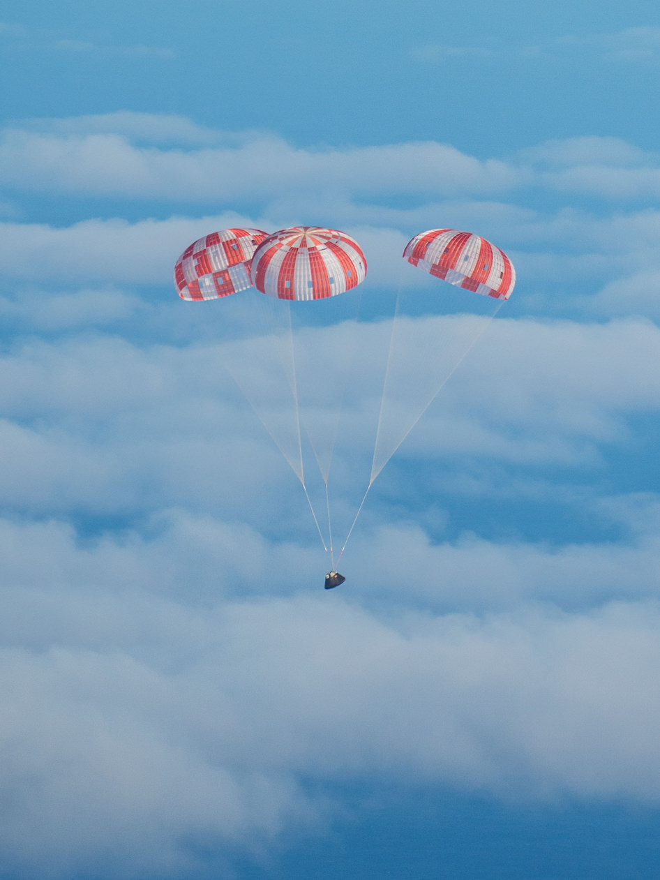 The on-board cameras continued to operate all the way through the 10 minute reentry period to unfurling of the drogue and three main parachutes and splashdown in the Pacific Ocean at 11:29 a.m. EST at about 20 mph.