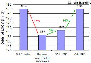 [/caption] Immediately after the Kosmos/Iridium satellite collision and factoring in other recent breakups which include the Chinese ASAT/Fengyun 1C, the Kosmos 2421, the risk of LOCV increased to 1 in 157 for Atlantis.