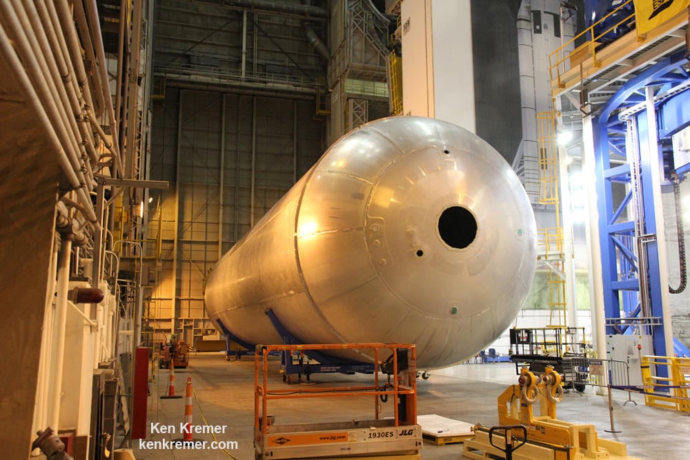 See my exclusive up close photos herein documenting the newly completed tank as the first media to visit the first SLS tank. I saw the big tank shortly after it was carefully lifted out of the welder and placed horizontally on a storage cradle on Michoud's factory floor.