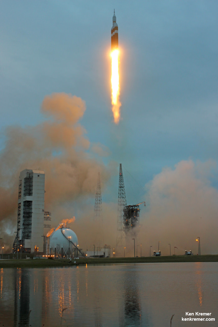 Orion's inaugural launch on Dec. 5, 2014, atop United Launch Alliance Delta IV Heavy rocket at Space Launch Complex 37 (SLC-37) at Cape Canaveral Air Force Station, Florida at 7:05 a.m. Credit: Alex Polimeni/Zero-G News/AmericaSpace[/caption]
