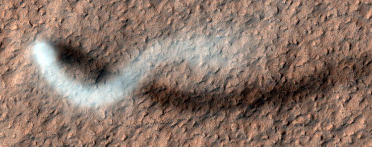 "We think it's similar to the Earth," Dr. Shane Byrne, an associate professor and assistant department head at the Lunar and Planetary Laboratory at the University of Arizona and a deputy principal investigator on HiRISE, tells *Universe Today*. "Dust devils are basically solar powered. The ground heats up so air starts to rise in columns. If the column is spinning, then it can get narrower and spin faster. As long as hot air is available at the bottom then the dust devil can survive. If the dust devil stops moving or moves over colder ground, then it dissipates. Dusty regions on Mars can have very hot surfaces during the day so they're good areas to form dust devils."