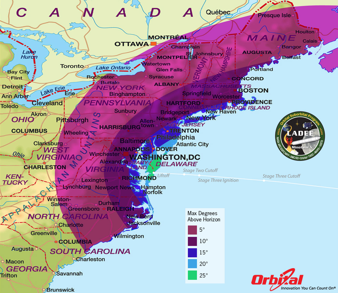 LADEE Minotaur V Launch - Maximum Elevation Map The LADEE nighttime launch will be visible to millions of spectators across a wide area of the Eastern US -weather permitting. This map shows the maximum elevation (degrees above the horizon) that the Minotaur V rocket will reach during the Sep. 6, 2013 launch depending on your location along the US east coast. Credit: Orbital Sciences [/caption]