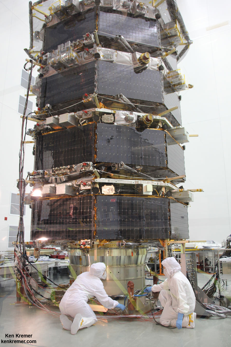 NASA's Magnetospheric Multiscale (MMS) observatories are shown here in the clean room being processed for a March 12, 2015 launch from Space Launch Complex 41 on Cape Canaveral Air Force Station, Florida. Credit: NASA/Ben Smegelsky[/caption]