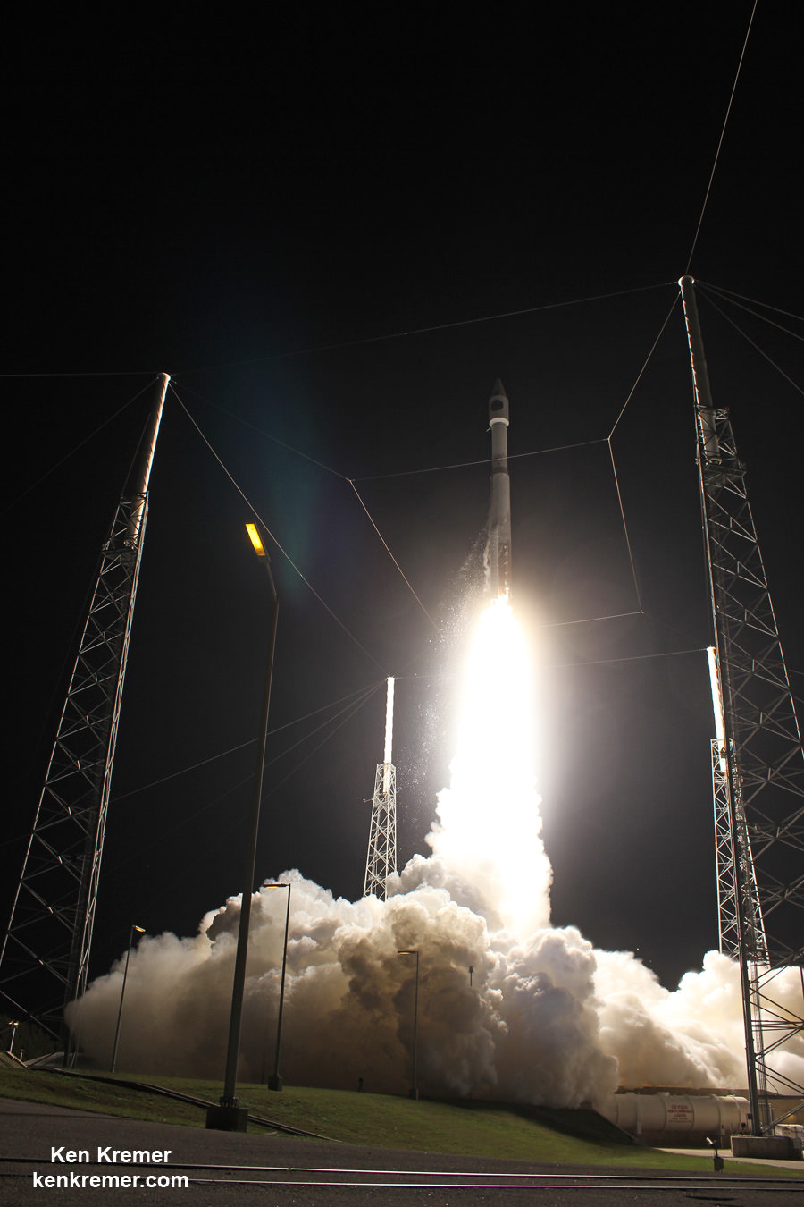The night launch of the venerable Atlas V booster turned night into day as the 195 foot tall rocket roared to life on the fiery fury of about a million and a half pounds of thrust, thrilling spectators all around the Florida space coast and far beyond.
