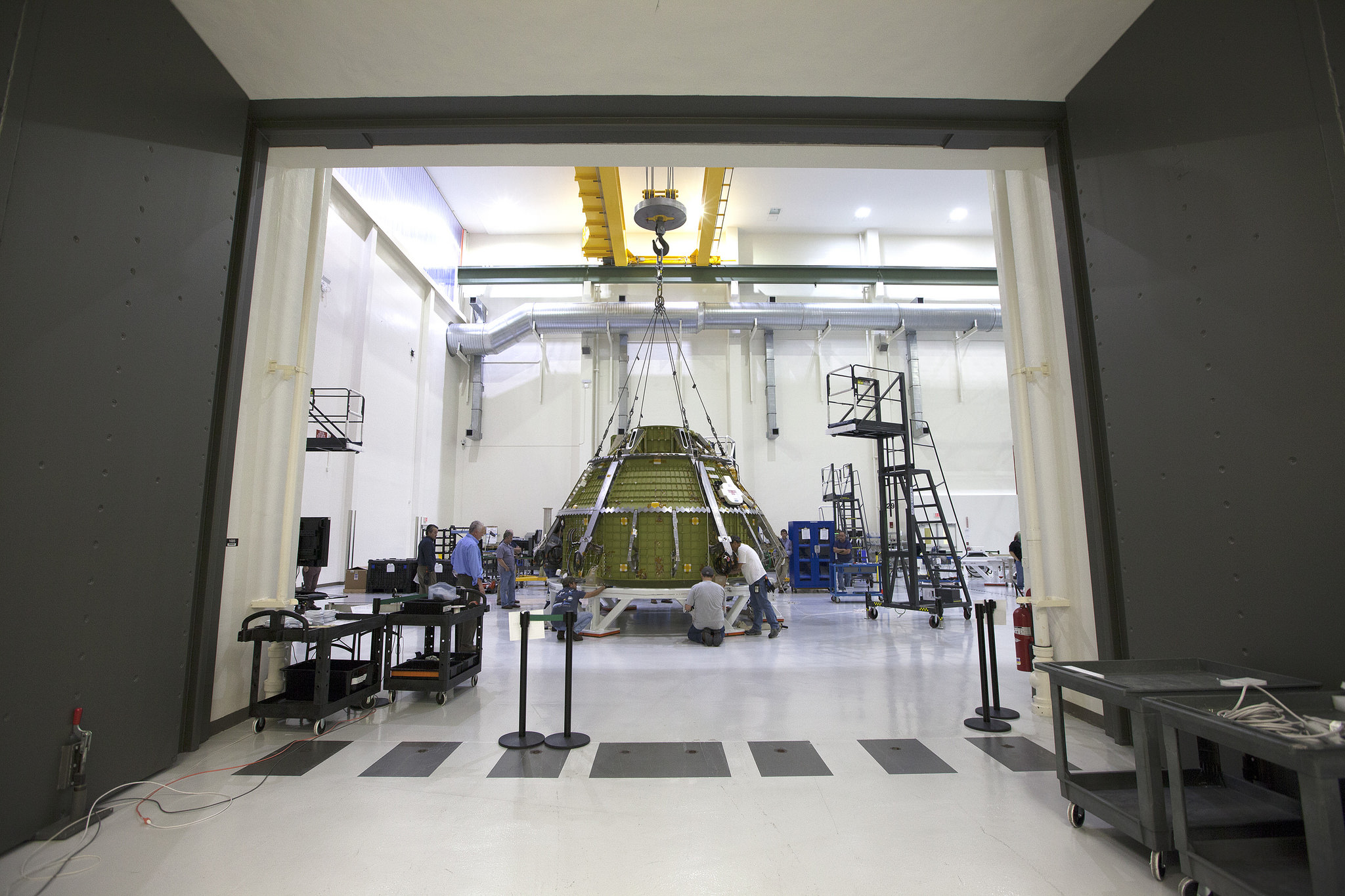 Orion was moved to a test stand inside the proof pressure cell high bay and locked inside behind large doors.